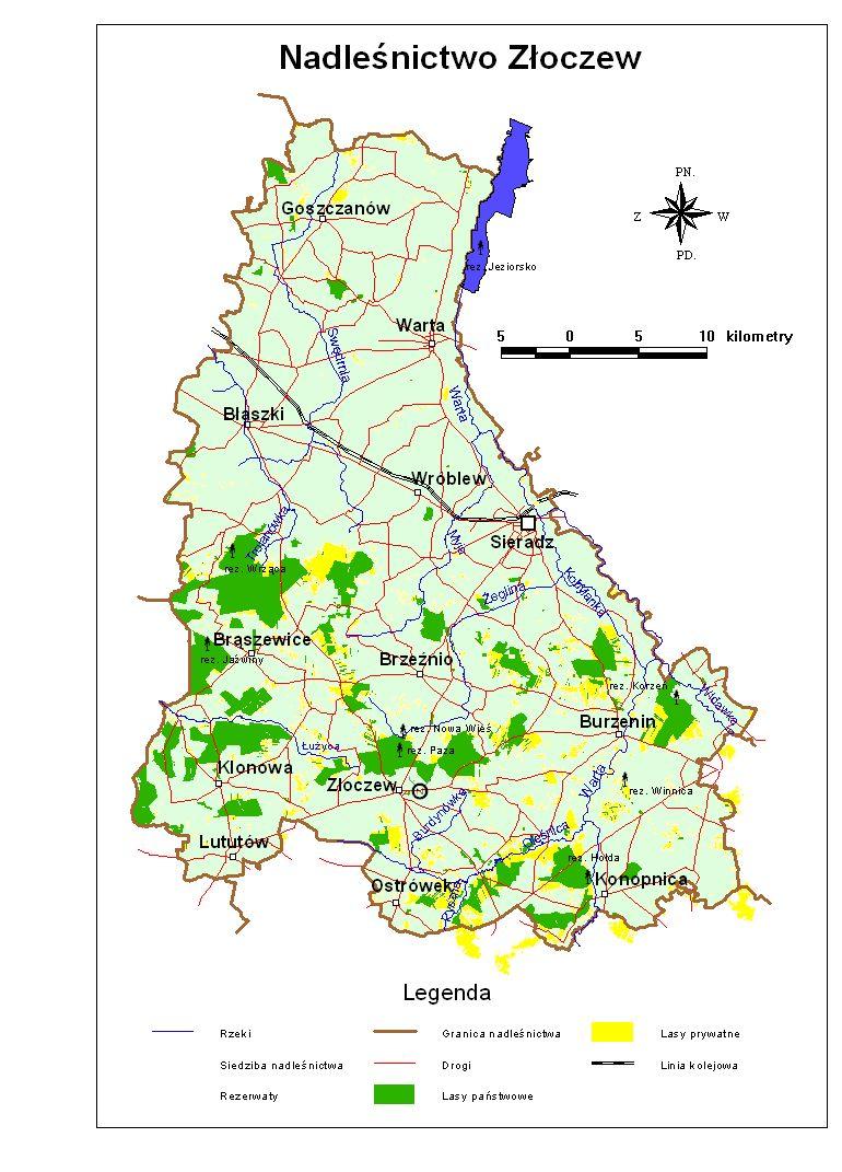 Grunty Nadleśnictwa Złoczew położone są na terenie pięciu powiatów województwa łódzkiego (sieradzkiego, łaskiego, wieluńskiego, zuńskowolskiego i wieruszowskiego) i obejmują piętnaście gmin (Widawa, Błaszki, Brąszewice, Brzeźnio, Burzenin, Goszczanów, Sieradz, Warta, Wróblew, Konopnica, Ostrówek, Klonowa, Lututów, Zapolice, Złoczew).